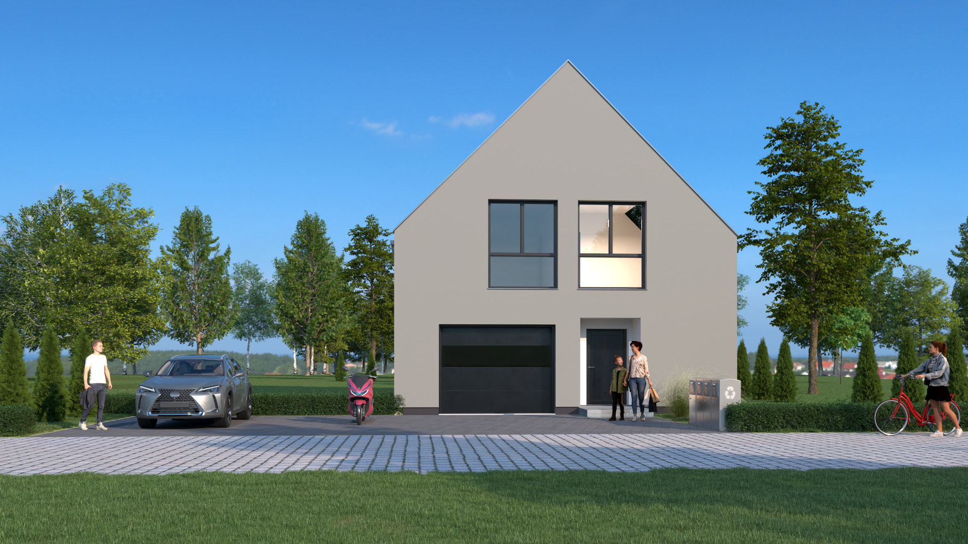 Jasne tynki, dach w kolorze antracytu oraz stolarka w odcieniu szarego jedwabiu nadają elegancji, a dodatki w kolorze jasnego dębu podkreślają charakter bryły.